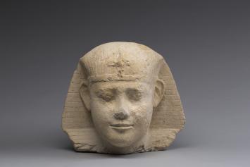 Cette tête, de grandes dimensions, est donc celle d’un pharaon. Du fait de son état très fragmentaire, il est impossible de déterminer le type de statue auquel elle appartenait. Il pourrait s’agir d’une statue debout, assise, voire même d’un sphinx.