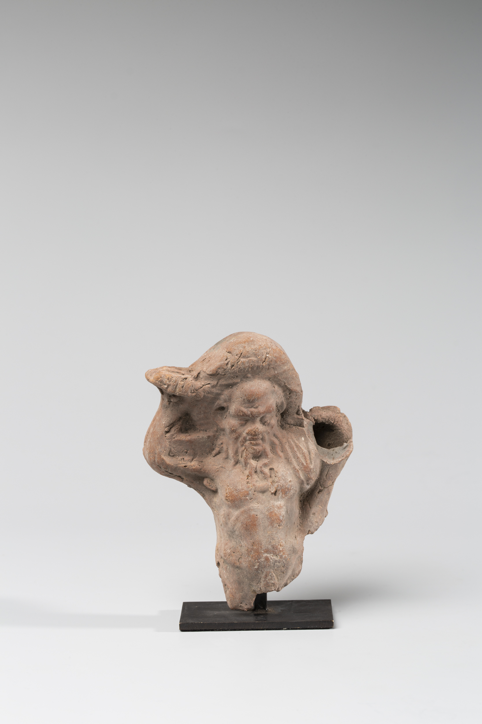 Priape est bien représenté au sein du large corpus de la petite plastique égyptienne d’époque hellénistique. Equivalent grec de Min, divinité associée à la fécondité, Priape est vénéré comme protecteurs de la nature sauvage et de la nature domestiquée (champs et jardins). Priape, Min et Harpocrate forment un trio de divinités personnificatrices de la fécondité. Priape tient ici pour attribut, en commun avec Harpocrate, une corne d’abondance symbolisant sa puissance fertilisatrice, de même que sa couronne de fleurs alvéolée.