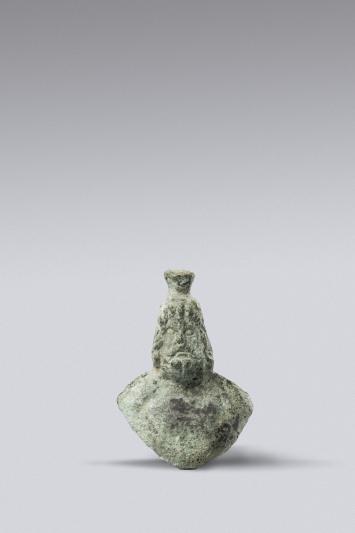 La figurine représente le buste de Sérapis. Le dieu est couronné du calathos, un couvre-chef en forme de corbeille décorée de rameaux d’olivier ou d’épis de blé. Il s’agit d’un attribut des divinités gréco-romaines adoptant la forme d’un boisseau, symbole d’abondance et de fertilité (voir MALAISE Michel, « Le calathos de Sérapis », Studien zur Altägyptischen Kultur 38, 2009, p. 173-193, consultable en ligne). Le calathos est ici de forme trapézoïdale ; son bord supérieur est légèrement ourlé. Bien qu'épaisses, les boucles de la chevelure et de la barbe -bifide- du dieu se laissent à peine observer aujourd'hui. Une bélière a été installée à l'arrière de la figurine ; il s'agit d'un pendentif, ou éventuellement d'une applique.