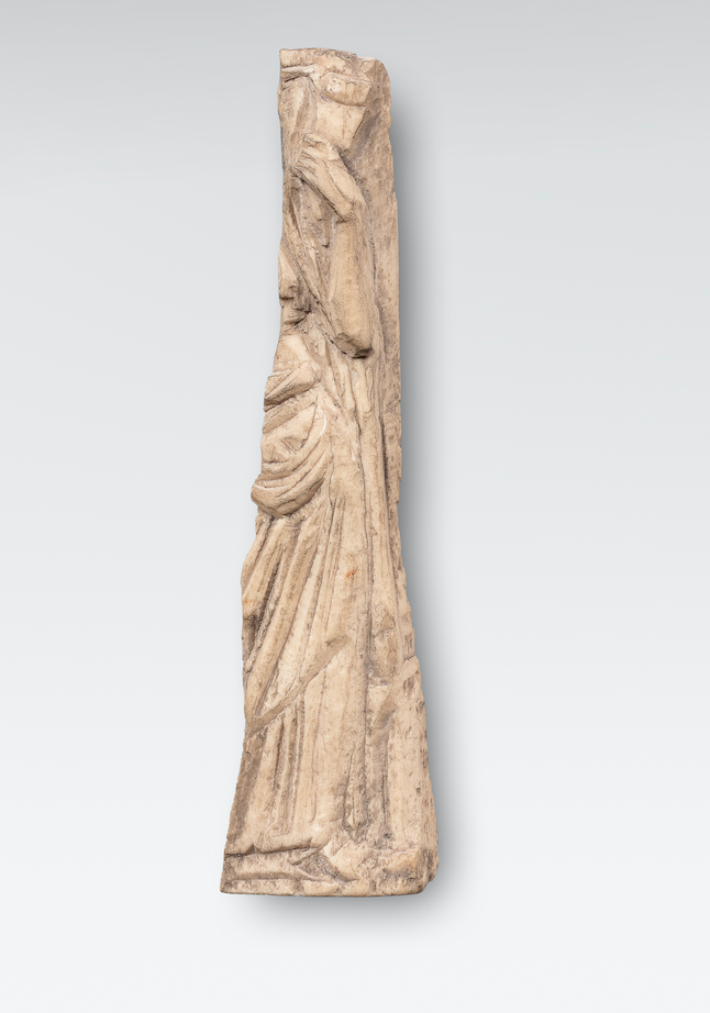 Amputée de son côté droit et de son visage, la figure offre les traits distinctifs du type iconographique de la femme drapée, défini par L. Marangou (MARANGOU 1976 p. 57-58). Treize appliques du musée Benaki et dix du musée Rodin répondent à ce schéma. Ces figures féminines, légèrement déhanchées, sont vêtues d’un long chiton, replié sous l’aisselle droite, autour duquel est enroulé un himation. Elles serrent souvent dans leur main droite une petite couronne, alors qu’elles tiennent une cornucopia dans la main gauche. Nous distinguons encore sur notre fragment la forme de la corne d’abondance au dessin simplifié, ainsi que l’étoffe de l’himation, au pan incisé de plis en biais.