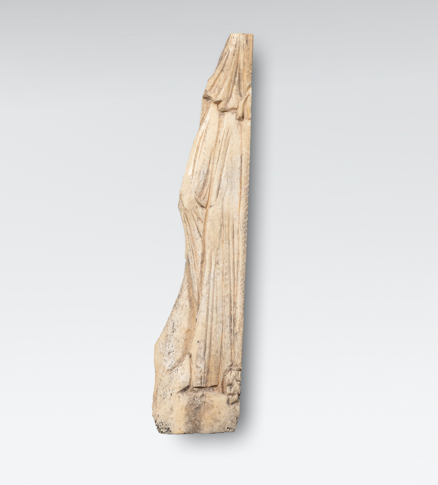 La partie dextre de l’applique est brisée, la cassure ayant suivi les contours du drapé. L’os, de couleur claire, est légèrement terni par la couche de salissure sur la face principale. Le bord senestre et le bord inférieur sont conservés presque entièrement. On note quelques griffures sur la cuisse du personnage et à l’arrière-plan, ainsi qu’un petit éclat au bas du vêtement.