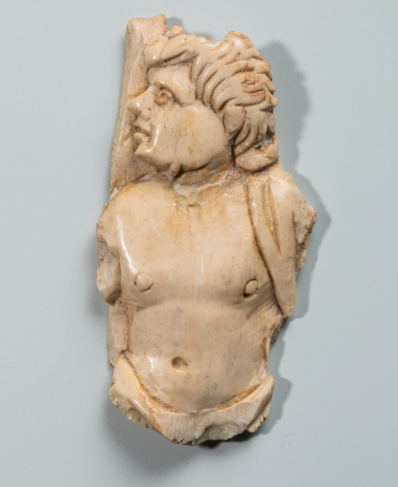 La posture, le torse nu et la chevelure du jeune homme invitent à y reconnaître peut-être un Triton. Participant au cortège de Poséidon et Amphitrite, ces divinités marines accompagnent les Néréides, environnés de monstres aquatiques. Quelques pièces consacrées à l’évocation du thiase marin offre des similitudes avec notre fragment et tendent à valider notre hypothèse. Les attitudes du jeune Triton d’une large applique du musée archéologique de Split (MARANGOU 1976, p. 115 pl. 47b) ou d’un élément de placage allongé du Victoria & Albert Museum (824-1905 : LONGHURST 1927, p. 22, BECKWITH 1963, p. 12, 49, fig. 27) rappellent celle de notre créature marine, comme leur chevelure et la musculature sensible de leur buste. Si le type iconographique tend à rapprocher cette pièce des appliques du IIIe-IVe siècle, la forte plasticité du buste et du visage pourrait nous inciter à placer sa fabrication avant.