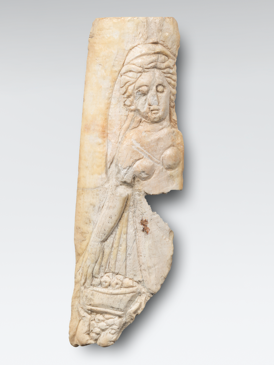L’association d’Éros à la divinité, sous la forme d’une silhouette enfantine, apparaît couramment dans l’art égyptien, de l’époque hellénistique à l’Antiquité tardive. Une applique se trouvant autrefois dans la collection Grüneisen (MARANGOU 1976, p. 40 n. 193), et plusieurs fragments conservés au musée Benaki (1239, 18928, 22180 : MARANGOU 1976, p. 40, p. 110-111, pl. 39 ad, pl. 38c), montrent l’existence de scènes convoquant Aphrodite, assistée par un ou plusieurs amours. Toutefois, la comparaison la plus frappante consiste en un feuillet de diptyque d’ivoire lacunaire répertorié dans l’Antikensammlung de Berlin et attribué au Ve siècle (PLATZ-HORSTER 2018, n° 144 p. 99-100, ill. p. 242). Cette œuvre, ainsi que le fragment du musée Rodin, semblent dériver d’un modèle commun. Bien que le travail soit plus soigné sur l’objet de Berlin, Aphrodite adopte une pose similaire et arbore un visage stylistiquement proche de notre exemplaire. La figure de l’amour, par contre, se trouve rejetée sur son côté gauche. L’Éros à la courte chevelure bouclée, portant de ses bras tendus un panier rempli de fruits globulaires, se rencontre aussi sur une pièce provenant d’Antinoé, conservée aujourd’hui au Musée royal d’Art et d’Histoire de Bruxelles (E.05325 : O’CONNELL 2014, p. 420, pl. 115 p. 444).