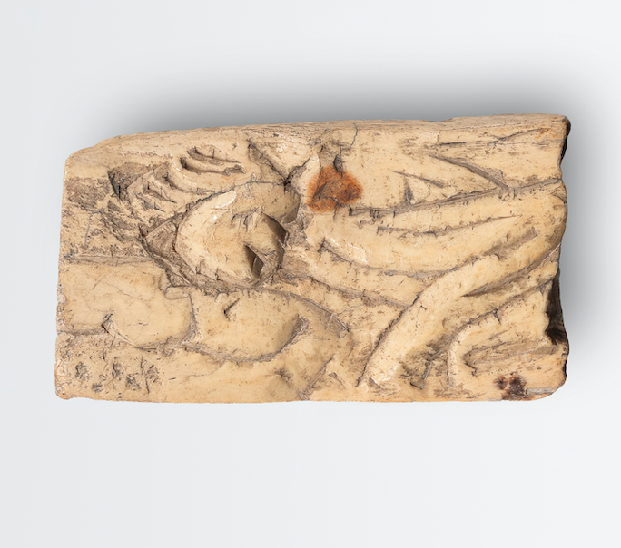 Offrant une teinte beige clair, ce fragment révèle de larges taches ocre orangé et brun, à la fois sur la face principale et le revers. La partie senestre de l’applique est perdue, et l’angle supérieur dextre est endommagé par un petit éclat. On note un léger fendillement longitudinal de la matière osseuse, notamment en partie supérieure. Les parties incisées emprisonnent encore des sédiments.