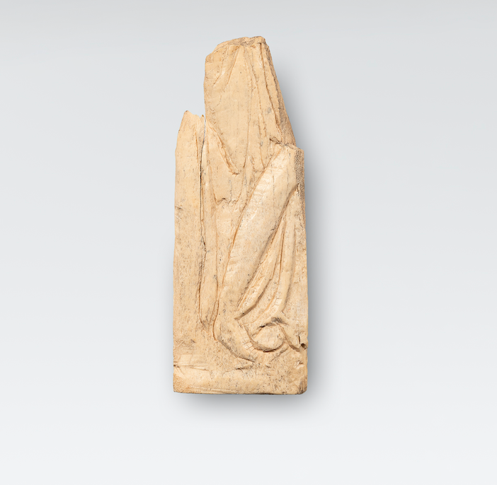 Le fragment offre une teinte ivoirine uniforme sur la face sculptée ; le dos révèle un coloris légèrement plus rosé. Une couche de salissure superficielle recouvre les deux côtés. La pièce est cassée en partie supérieure. Elle conserve une partie de ses bords latéraux et l’intégralité de son chant inférieur. Un fendillement longitudinal la fragilise. Coté dextre, une large fissure, engendrée par la cassure, court sur une grande partie de la hauteur de l’élément de placage.