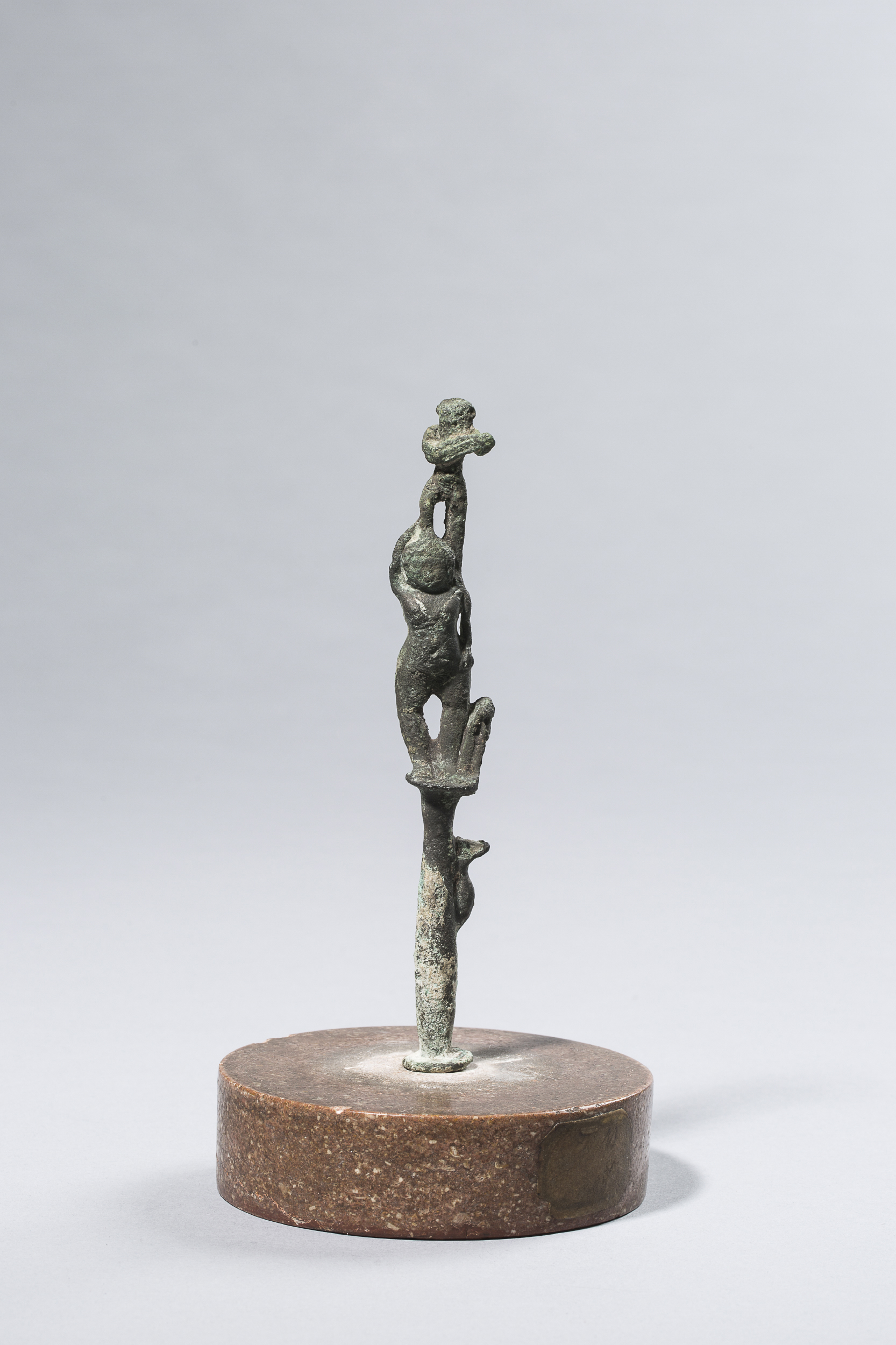 Tant l’objet que la scène est rare, mais attestée en Égypte ancienne. L’association de Bès au dieu Thot, représenté ici grâce à la présence du babouin, rappelle le Mythe de le Déesse Lointaine (cf. CORTEGGIANI Jean-Pierre, L’Égypte ancienne et ses dieux : dictionnaire illustré, Paris, 2007, p. 298-299). Cette légende raconte une dispute, particulièrement violente, entre Rê et une déesse féline dont l’identification change selon les versions. Selon le Livre de la Vache Céleste, la colère de la déesse, souvent assimilée à Mout, Sekhmet ou Tefnout, est due à l’humiliation d’avoir été trompée par son père Rê. Celui-ci ayant ordonné à sa fille le massacre des humains, la déesse exauça les souhaits de son père au-delà de ses espérances. Pour calmer ses ardeurs, Rê décida d’enivrer la déesse avec de la bière rougie artificiellement, simulacre de sang humain. Humiliée, la déesse se refugia dans une lointaine contrée située en Nubie. Rappelée par Rê, la déesse orgueilleuse refusa de mettre fin à son exil volontaire. Rê envoya alors Thot sous la forme d’un babouin et Chou, appelé ici Onouris (« Celui-qui-ramène-la-Lointaine ») pour convaincre la déesse de revenir. Apaisée, la déesse retourna en Égypte, accompagnée de Bès qui la divertit en jouant et dansant tout au long du voyage.