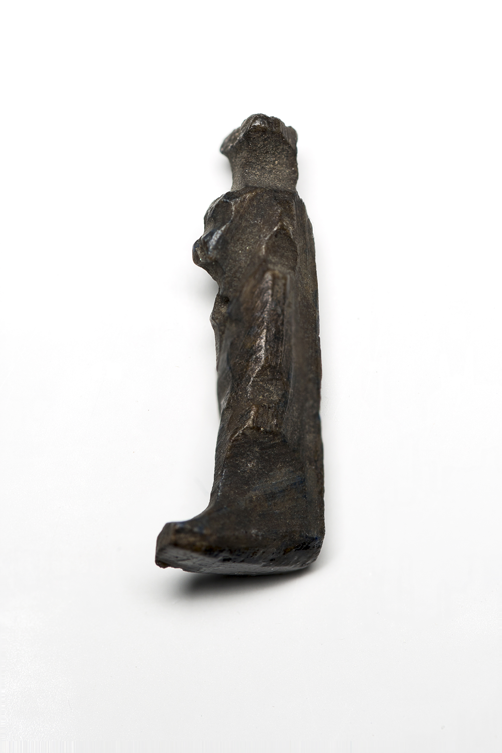 Il s’agit d’une figurine de très petite dimension représentant un personnage debout, dans la position de la marche, la jambe gauche légèrement en avant de la jambe droite. Les bras retombent le long du corps. L’état de conservation ne permet pas de distinguer avec précision les détails des vêtements portés par le personnage, mais on remarque l’extrémité d’un vêtement au niveau des chevilles. La tête est surmontée d’une perruque tripartite dont les deux mèches du devant retombent en haut de la poitrine. Le personnage est également coiffé d’une coiffe de type mortier. De forme carrée, ses bords adoptent la forme d’un petit plateau. La réalisation trop frustre de la figurine empêche de distinguer les traits du visage ; la forme du nez et l’emplacement des yeux se devinent ainsi que la naissance d’une barbe, cassée à l’heure actuelle. Le dos repose sur un pilier dorsal dont l’extrémité supérieure est cassée au niveau du crâne. Il est donc possible qu’à cet emplacement se trouvait un anneau de suspension. La figurine repose sur une base, légèrement cassée au regard du pied gauche. Cette base s’inscrit en continuité du pilier dorsal. Sa surface inférieure étant restée légèrement incurvée, la figurine n’est pas stable et ne tient pas debout sans support.