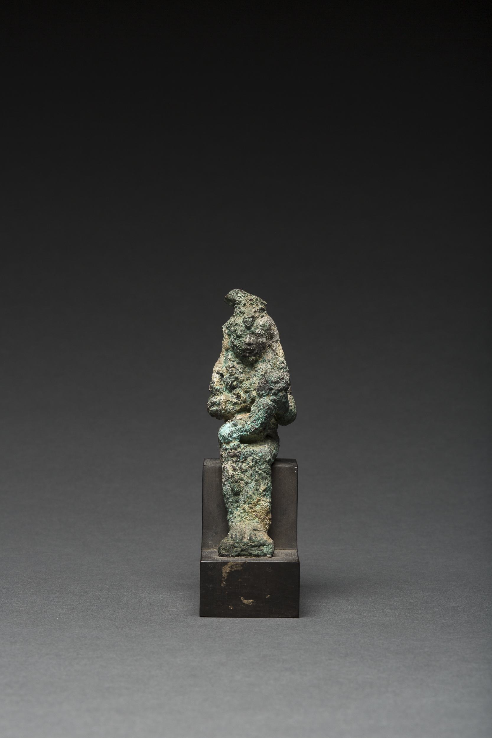 À la Basse-Époque, Isis obtient un culte propre qui la démarque peu à peu du mythe osirien et par conséquent des cultes funéraires. Dans la pensée populaire, elle est étroitement associée à Hathor, déesse vache incarnant la prospérité grâce à son image nourricière. Elle reprend ainsi symbolisme et attributs d’Hathor, notamment les cornes de vache flanquant le disque solaire de la couronne. Isis devient par la suite l’emblème de la féminité en tant qu’épouse d’Osiris et mère d’Horus et l’une des déesses les plus populaires. Pour une présentation générale d’Isis, voir DUNAND Françoise, Isis, mère des dieux, Paris, 2000 puis Arles, 2008 et CORTEGGIANI Jean-Pierre, « Isis », L’Egypte ancienne et ses dieux. Dictionnaire illustré, s. l., 2007, p. 244-249. Sur le rayonnement d’Isis dans le monde méditerranéen, voir le catalogue de l’exposition à Milan en 1997, ARSLAN Ermanno A. (dir.), Iside. Il mito, il misterio, la magia, Palazzo Reale, 22 février-1er juin 1997, Electa, Milan, 1997.