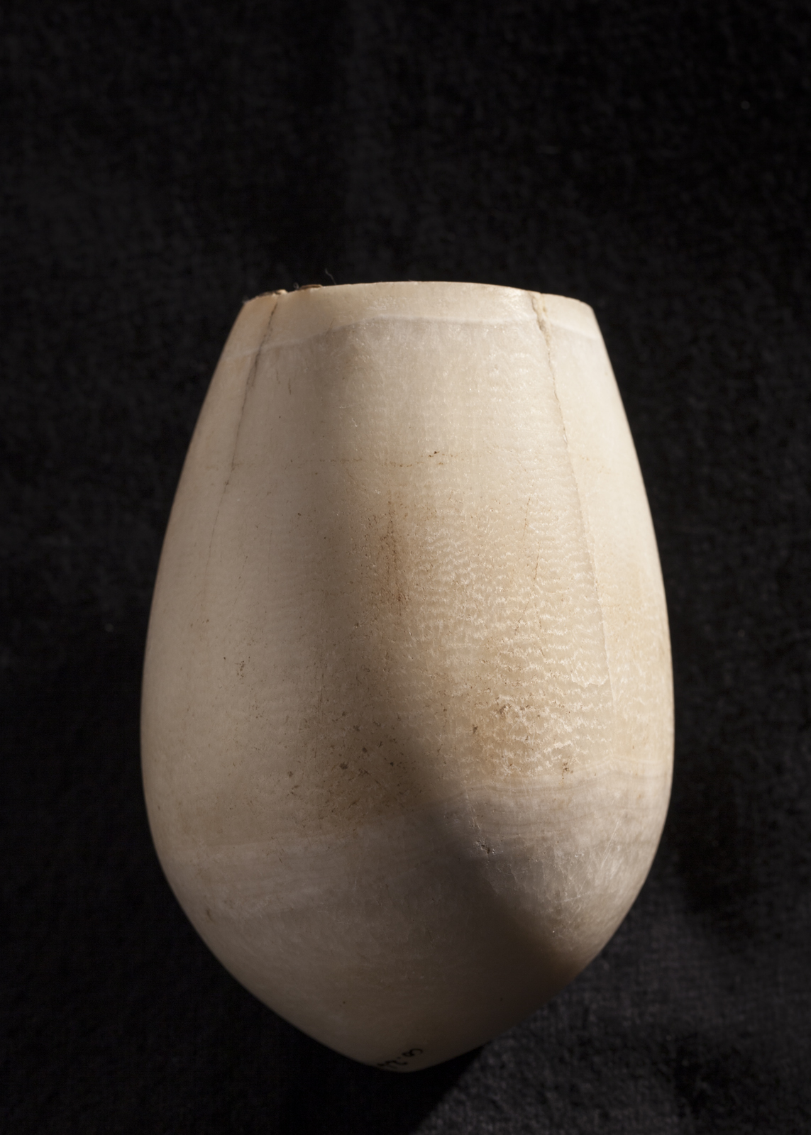 Ce petit vase est en albâtre égyptien, semi-translucide, de couleur blanc crème, avec des veines plus blanches.