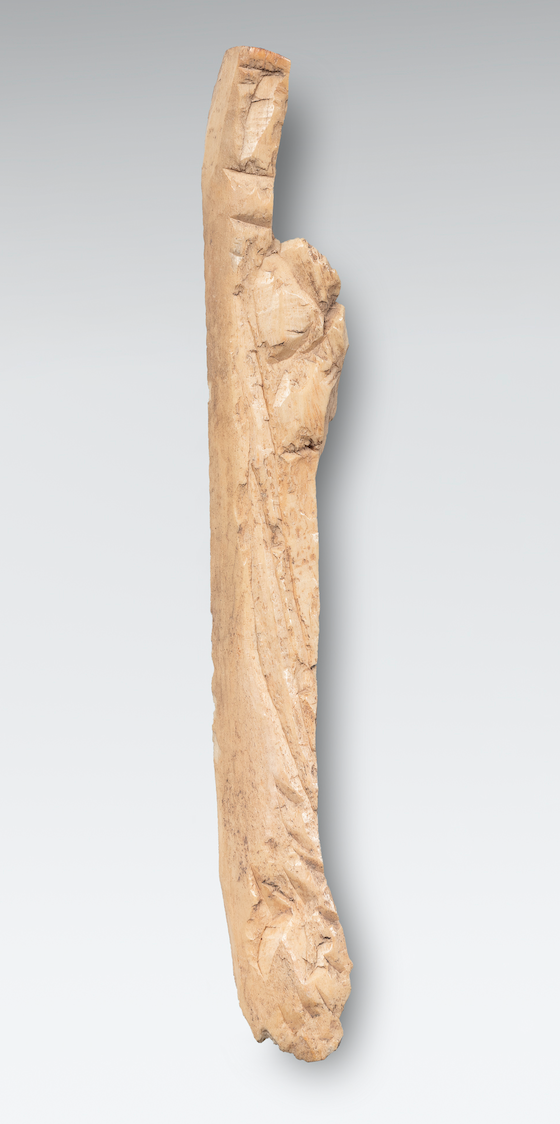 Ce fragment au décor très frustre constituait peut-être un pilastre orné de motifs végétaux et floraux, couronné par un chapiteau, ou au contraire supporté par une base moulurée. Un tel exemple existe dans les collections du Staatliche Museum Ägyptischer Kunst de Munich (ÄS 5931 : WILDUNG 1976, p. 275). Sur le fût de cet exemplaire de pilastre miniature se développe un rinceau d’acanthe stylisé garni de fleuron à quatre pétales. L’aspect particulièrement heurté des contours et la définition maladroite des motifs notre pièce l’éloigne de cette analogie et semblent l’ancrer dans une période plus tardive. Aussi peut-on proposer d’inscrire sa production au cours du Ve-VIe siècle.