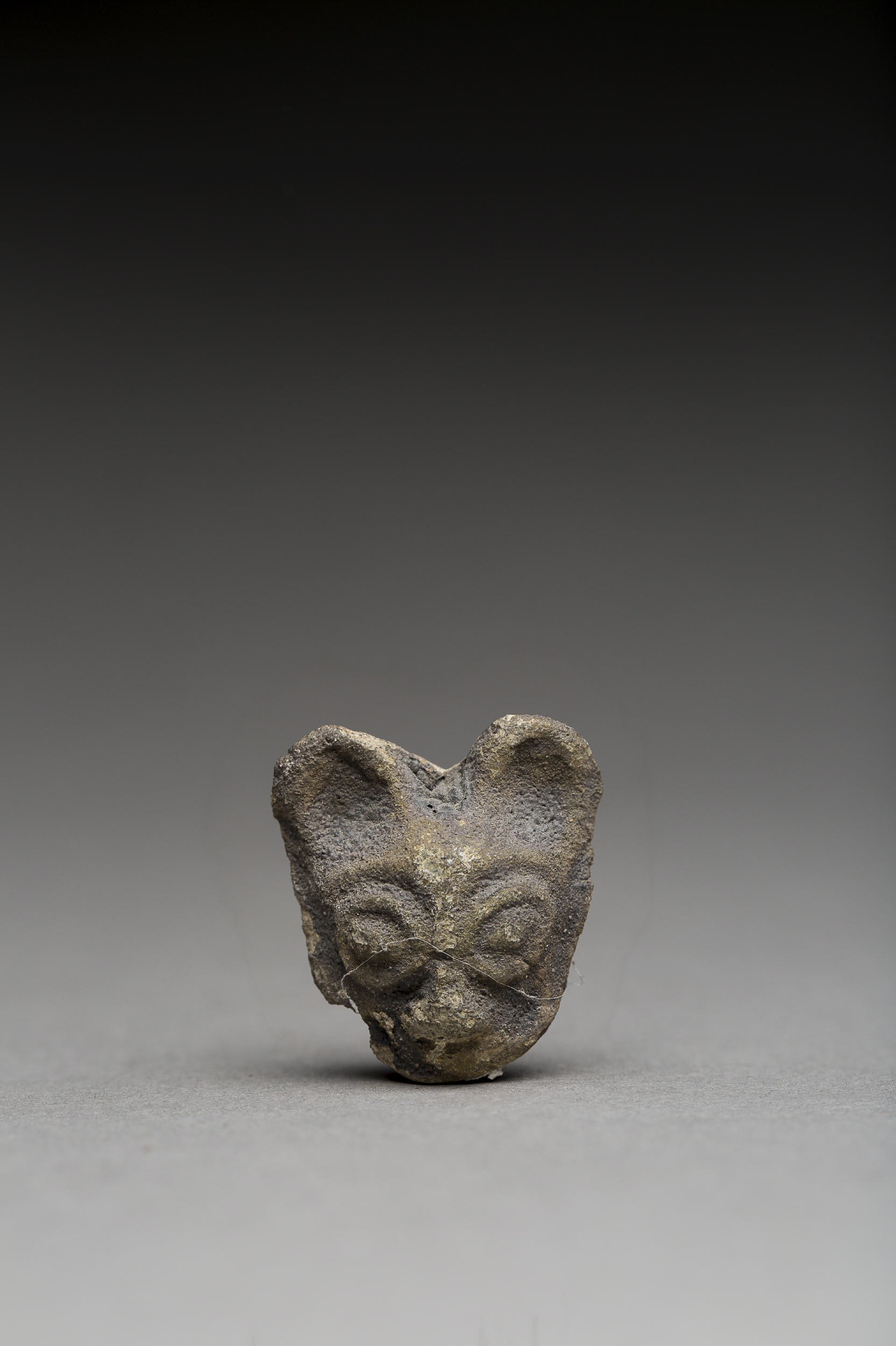 Cette petite plaque de calcaire épouse les contours d’une tête de chat. Les oreilles, proéminentes, sont dressées et légèrement arrondie. Les yeux sont grands ouverts et très en reliefs. Etirés en amande, les paupières sont soigneusement indiquées et les pupilles sont saillantes. Le museau est épaté. La truffe est de petite taille et la gueule fermée. Toute la face de l’animal est badigeonnée d’épais pigments noirs, y compris la partie arrière des oreilles, visible au revers. Des pigments blancs sont visibles sur tout le nez, de l’arête jusqu’au bout. L’arrière de ce qui eut être considéré comme un masque est plat et n’a reçu aucun pigment.