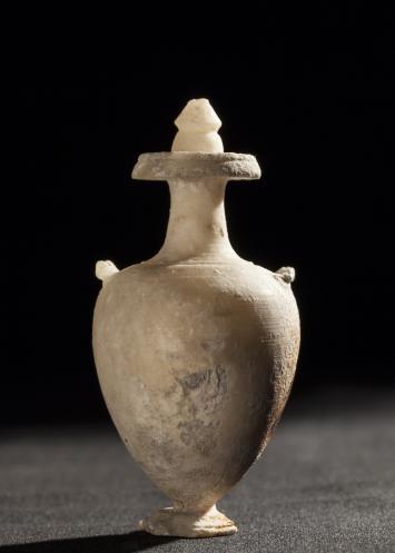 Cette hydrie miniature est en albâtre gypseux (?) blanc crème, avec des taches plus blanches. Il s'agit d'un vase à panse ovoïde, à col étroit, qui se termine en collerette plate de 6 mm d’épaisseur. Une petite anse horizontale orne chaque côté de l’épaule. Le fond pointu est muni d’un petit pied circulaire. Le vase est obturé au moyen d’un petit bouchon conique qui semble avoir été collé.