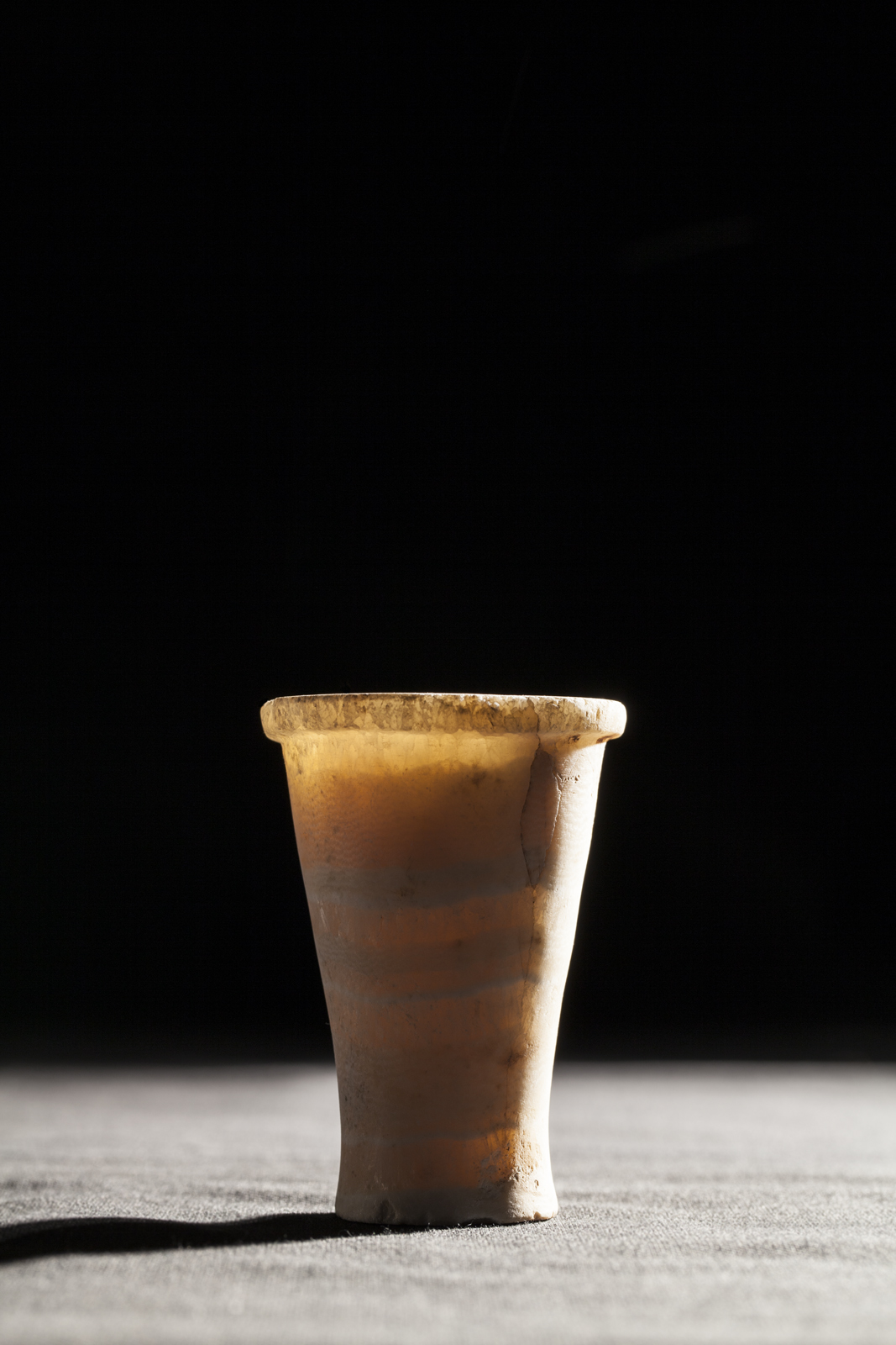 Ce type de vase est très courant en Égypte, notamment à l’époque thinite et à l’Ancien Empire. Il s’agit du « vase à onguent » cylindrique, appelé bas par les Anciens Égyptiens. Sa forme est simple : un gobelet à parois droites, évasées ou concaves, muni d’une lèvre plate sur le dessus, et pourvu ou non d’un pied. Les exemples les plus anciens, des époques prédynastique et thinite, peuvent être très grands (25-40 cm.). Ils sont parfois décorés d’un motif de corde en relief placé en haut de la panse. A partir de la fin de l’Ancien Empire, leur forme est plus élancée, et le vase présente un pied large. Ceux du Moyen Empire sont plus petits (moins de 13 cm. de haut), et cintrés (cf. ASTON 1994, p. 99-105 ; EL-KHOULI 1978, pl. 1-46 pour les typologies). Cette forme perdure jusqu’au Nouvel Empire (voir les exemplaires inscrits provenant des dépôts de fondation du temple d’Hatchepsout à Deir el-Bahari, conservés au Metropolitan Museum of Art de New York).