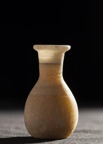 Ce petit vase est en albâtre égyptien de couleur jaune miel pâle, rubané autour du col et en haut de la panse. Il a une panse ovoïde à base plane, surmontée d'un long col droit à lèvres légèrement débordantes. muni d’un col droit de 2,3 cm. de haut. La collerette, plate sur le dessus et en-dessous, mesure 3 mm de hauteur.
