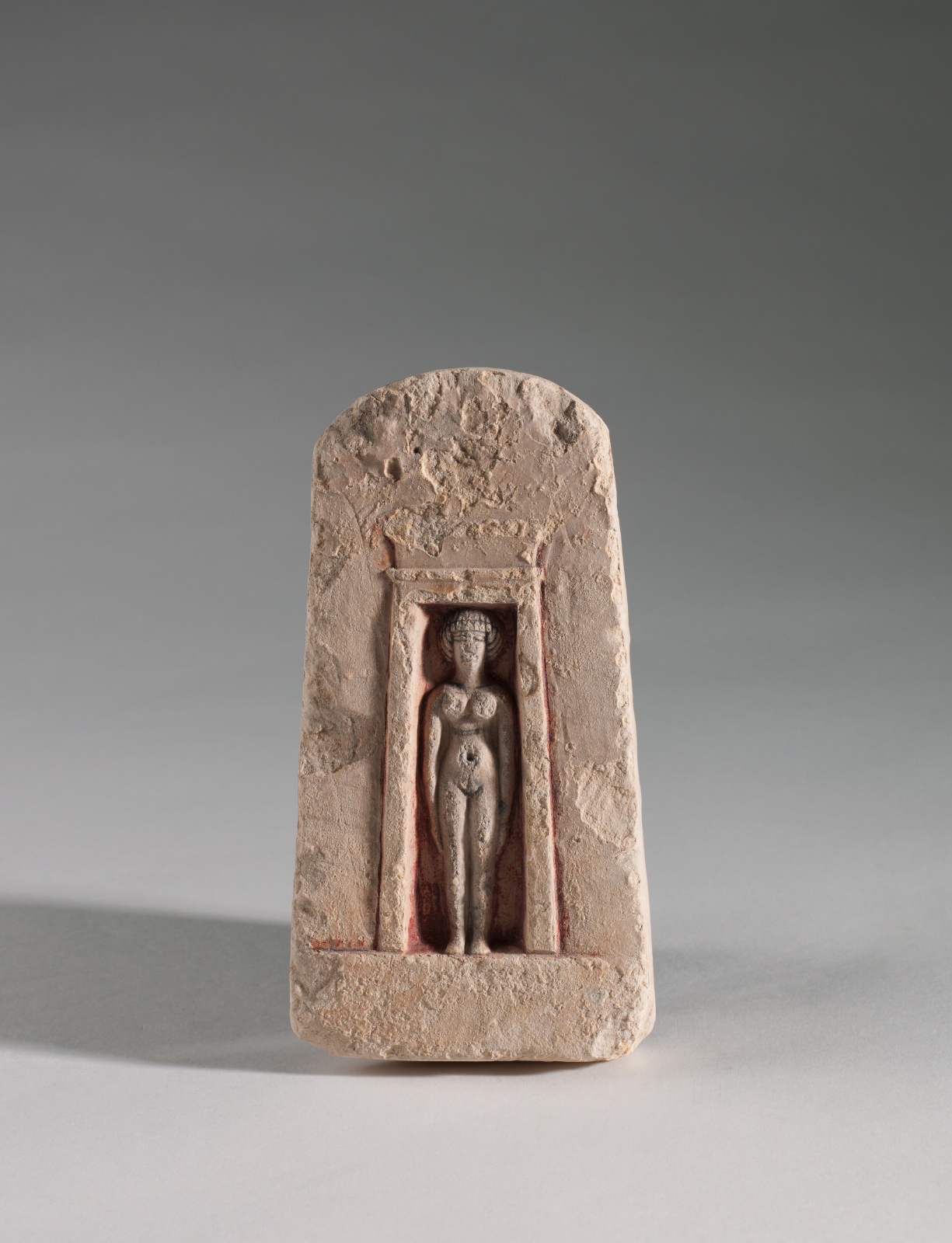 La forme générale de l’objet semble épouser la forme d’un naos et un naos est lui-même représenté en relief sur l’objet, posé sur une ligne horizontale faisant office de base. Il y aurait donc une superposition de deux naos. L’intérieure de la niche est colorée de pigments ocre ainsi que sur les contours du naos, à l’exception de la partie supérieure qui est fortement abîmée. Les faces du naos, notamment les parties supérieures, sont également ornées de traces ocre mais dans des teintes plus claires qu’au niveau des contours. L’endroit est altéré et l’on remarque de nombreux éclats. Les angles inférieurs sont cassés. Le revers est également abîmé et laisse apparaître de nombreuses traces d’outils faisant penser à des ciseaux. De nombreux restes de terre de fouille ont été trouvées au revers.