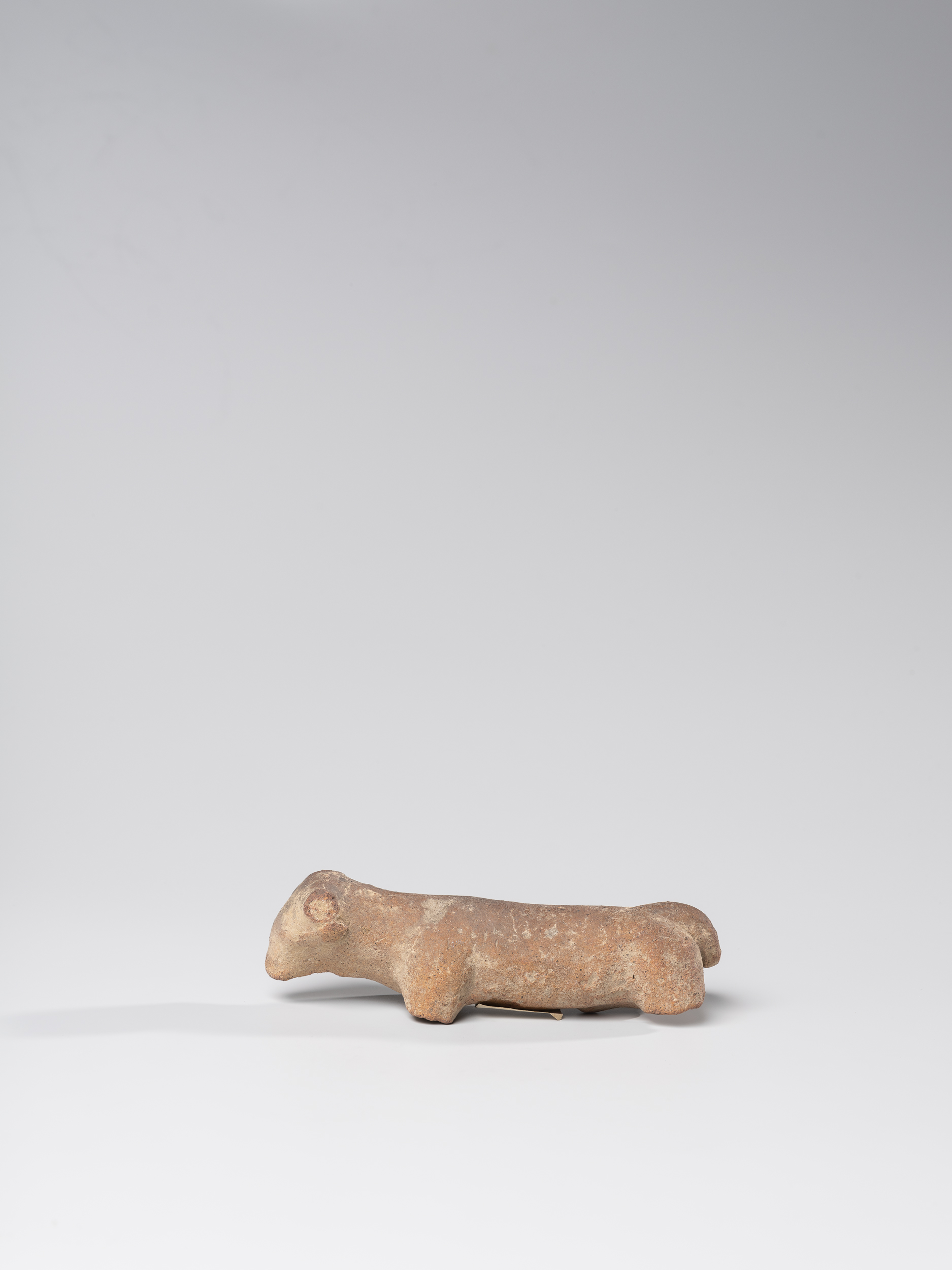 Il s’agit d’une figurine de taureau. L’animal debout est représenté debout, la queue rabattue sur la croupe droite. Le phallus est représenté mais la tête n’est pas détaillée.