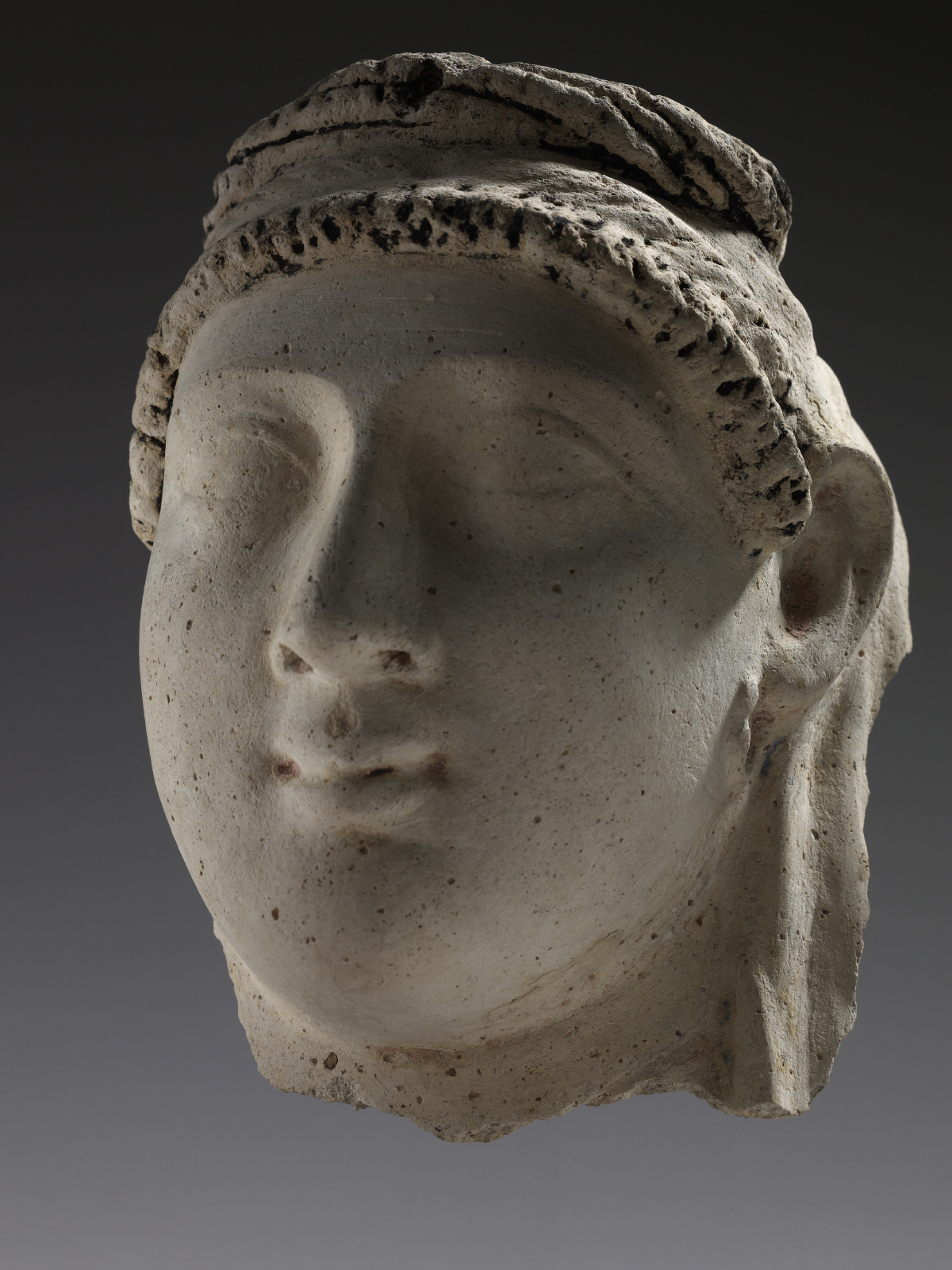 Le visage est complet. A droite, un fragment du dosseret est conservé.