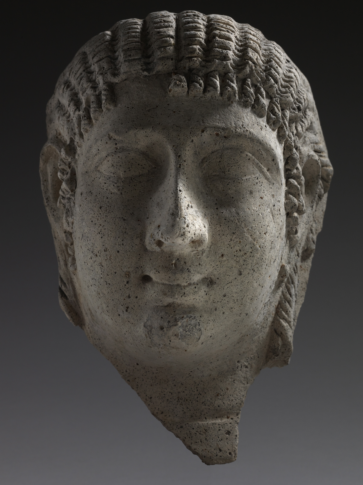 La coiffure est d’inspiration ptolémaïque, typique du Ier siècle après J.-C. Le masque Co. 3246 du musée Rodin en est un autre exemple, à la différence que plusieurs rangées superposées de bouclettes couvrent le front. Le visage, en ovale allongé et uniquement peint, est par ailleurs assez similaire.