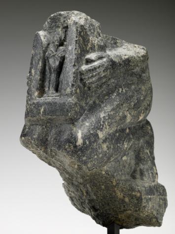 Le personnage, agenouillé sur ses talons et les orteils reposant sur le socle, présente devant lui un naos rectangulaire, dont la forme est bien identifiable même si la partie supérieure est endommagée. Il est posé sur ses genoux et légèrement incliné vers l’arrière. D’une hauteur totale de 13,3 cm, il abrite une image d’Osiris, réalisée en très haut relief. Le dieu est représenté debout sur un petit piédestal. Momiforme, son corps est entièrement gainé mais ses formes se devinent sous le linceul, d’où seules les mains dépassent. Il a les bras croisés sur la poitrine ; il tient dans la main droite le sceptre héqa et dans la main gauche le fouet nekhakha ou flagellum, attributs traditionnels du dieu. Il porte sur la tête une couronne atef (haute tiare flanquée de deux larges plumes d’autruche). Le visage du dieu est allongé ; ses yeux, nez, bouche et oreilles ont été matérialisés en dépit de la dureté de la pierre. Il est figuré avec une barbe, dont l’essence divine se reconnaît à la courbure de son extrémité. Si le naos adopte ici sa forme la plus simple, il peut, dans certains cas, prendre une apparence qui rappelle la façon dont se présente l’effigie de la divinité dans le saint des saints. Il peut ainsi être couronné d’une corniche à gorge, orné d’un disque solaire ailé ou encore se terminer par un sommet bombé (PERDU, 2012, p. 59).