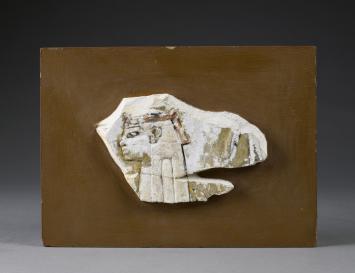 Conservée jusqu’au niveau du buste, la figure féminine est habillée d’un vêtement enveloppant. Elle porte une perruque tripartite, ceinte d’un bandeau ocre rouge noué à l’arrière du crâne. Les yeux, très étirés et cerclés d’un trait de fard, sont placés en oblique. Sous un petit nez modelé avec précision, les lèvres sont charnues. Derrière la figure féminine, un motif également fragmentaire est difficilement identifiable. On est tenté d’y reconnaître un sceptre-ouas, bien qu’il soit difficile de le confirmer.
