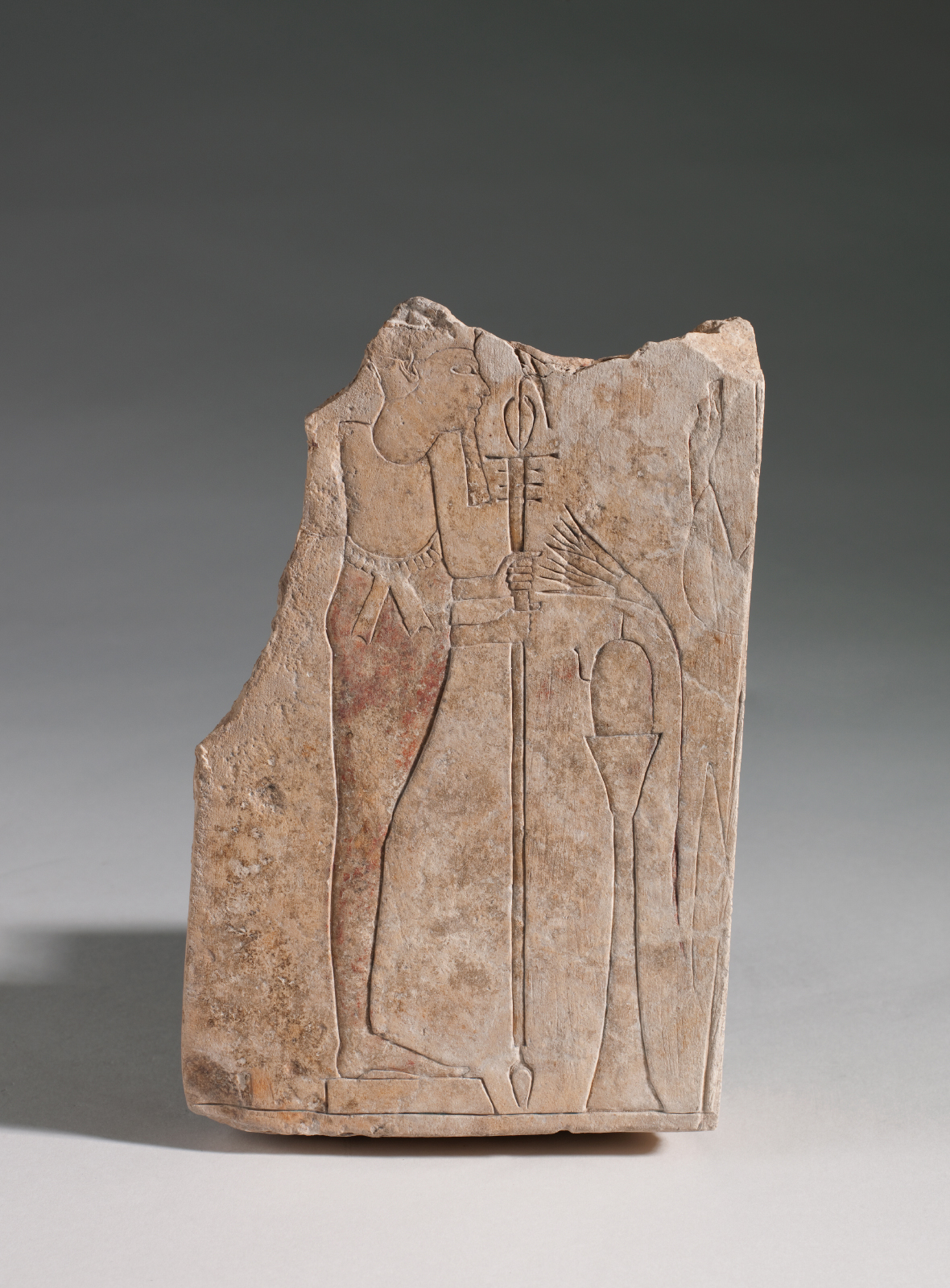 Ce relief correspond à un fragment de scène cultuelle avec le dieu Ptah. L’ensemble est gravé en léger creux. Le dieu est représenté debout, sur un petit piédestal, tourné vers la droite. Devant lui se trouve une table d’offrande surmontée d’un bassin à libation et d’une aiguière, au-dessus desquels une fleur de lotus à longue tige s’étend vers le dieu. On observe également une partie du corps et du bras droit élevé vers le dieu d’un personnage debout, tourné vers la gauche en posture d’adoration. Ce personnage est vêtu d’un costume, à larges manches non plissées. La couleur ocre clair conservée sur la main incite à y voir une représentation féminine. Devant ce personnage, un élément d’offrande - encore à identifier-, s’allonge depuis ses pieds. Une ligne matérialisant le sol a été incisée en creux sous la scène. Elle est partiellement comblée de pigments bleus. La représentation du dieu, debout, jambes serrées, est traditionnelle. Enserré dans un suaire, coiffé de sa calotte habituelle et arborant une longue barbe postiche tressée, évasée vers sa base, il tient des deux mains un sceptre composé du bâton ouas, du signe de vie ânkh et du pilier djed. L’œil du dieu, finement sculpté, est cerclé de fard ; fard et sourcil s’étirent jusqu’aux tempes. L’oreille du dieu est finement ourlée, son nez est droit et ses lèvres, relativement charnues, souriantes. Un large plastron recouvre ses épaules, fermé par un nœud à deux pans. Les couleurs qui représentent les rangs de perles ainsi que le contrepoids qui maintient ce collier dans la nuque ne semblent pas avoir été apposées. Bien que le dieu soit gainé dans un linceul, le rendu des détails morphologiques est respecté. En particulier, les deux mains qui jaillissent du linceul et se saisissent du sceptre sont bien une main gauche et une main droite. L’avant-bras droit a été placé sous l’avant-bras gauche, pour ne pas se superposer à l’avant-bras gauche en le croisant. De même, la voûte plantaire, nécessaire à la marche, est bien arquée. Le piédestal sur lequel est juché le dieu gainé adopte la forme du signe hiéroglyphique utilisé pour désigner la Maât, c’est-à-dire l’ordre cosmique, la règle, l'équilibre...Ptah est ici le dieu créateur par le verbe, maître du monde ordonné. Ptah, dont le nom signifie « celui qui crée », apparaît dès l’Ancien Empire. Il est le démiurge de Memphis, patron des artisans et des architectes. Il fait partie de la triade memphite en tant qu’époux de Neith (puis, tardivement, celui de Sekhmet) et père de Néfertoum. Ptah était particulièrement vénéré à l’Ancien Empire, période faste pour les grands programmes de construction qu’il patronnait. Au Nouvel Empire, Ptah dispose d’une vénération importante à Memphis et Thèbes. A Deir el-Médineh, village et nécropole des artisans de la région thébaine, il est le dieu « qui écoute les prières ». Au cours de la XIXe dynastie, à l’avènement de la période ramesside, Ptah retrouva le statut de dieu incontournable. Il reçoit un culte très important à Pi-Ramsès et occupe une place fondamentale dans la transmission monarchique. Ainsi Khâemouaset, célèbre fils de Ramsès II, était prêtre de Ptah. Le dieu conservera ce rôle jusque sous les Ptolémées, qui seront particulièrement liés au clergé de Ptah. La scène du bloc Co. 3413 illustre magnifiquement l’évolution des pratiques religieuses privées du Nouvel Empire. Les particuliers se représentent devant l’image d’un dieu, s’adressent directement à leurs divinités dont ils attendent qu’elles écoutent leurs prières et exaucent leurs requêtes. Il est probable que le relief, dont il faut souligner la finesse des tracés, se situait originellement dans une chapelle privée. Le style de ce relief évoquant le Nouvel Empire, il est possible de faire remonter sa datation à la période ramesside en raison du renouveau du culte du dieu à cette époque. Le relief présente des traces de polychromie, notamment de légères traces d’ocre et de bleu. Le suaire est peint en ocre, le manche du sceptre en jaune par endroit. La fleur du lotus est bleue, tandis que sa tige est ocre rouge. L’aiguière conserve des traces de pigments bleus (à gauche) et ocre rouge (à droite), tandis que son support est bleu. On retrouve également les traces du badigeon appliqué sur l’ensemble du relief. Cette couche se superpose avec un produit appliqué sur la pierre à l’époque moderne.