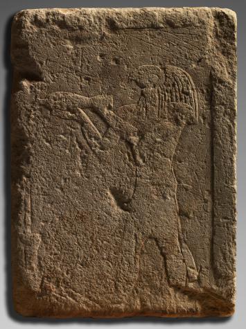 Sujet central de cette plaque rectangulaire, une divinité zoomorphe à tête de faucon se tient debout, effectuant une libation avec aiguière une aiguière. Une large bordure encadrant la scène est conservée le long du bord supérieur et droit. La tête du dieu est celle d’un rapace, arborant une longue perruque tripartite retombant derrière son dos et le long de son cou. Les mèches, épaisses, sont lisses. Le reste du corps est humain. Torse nu (aucun collier ni bracelet n’est actuellement visible), il est vêtu d’un pagne court à large ceinture. Le pan de ce pagne remonte à l’avant. Une longue queue de taureau est accrochée à l’arrière de son pagne, insigne de puissance porté par les divinités masculines et les rois dès les premiers temps de l’histoire égyptienne. S’avançant vers la gauche, la divinité, très vraisemblablement Horus, contrôle de la main droite l’écoulement du récipient qu’il tient fermement à l’horizontale dans sa main gauche (sur l’aiguière heset (signe W15 de Gardiner), vase à eau rituel le plus fréquemment utilisé par les dieux, les rois et les officiants, voir MESNIL du BUISSON 1935 p. 109-130). L’eau de libation s’épanche dans un grand vase allongé à long col, placé devant le dieu. La base du vase a disparu dans une cassure. Les deux bras d’Horus sont légèrement repliés ; la courbure de l’épaule gauche est trop anguleuse. Le dieu avance sa jambe droite. La position légèrement courbée de cette jambe indique qu’il ne s’agit pas seulement de la représentation d’un mouvement de marche, mais également que cette jambe sert d’appui au dieu (une aiguière remplie d’eau et tenue à main levée est pesante). Les pieds du dieu ne sont pas visibles.