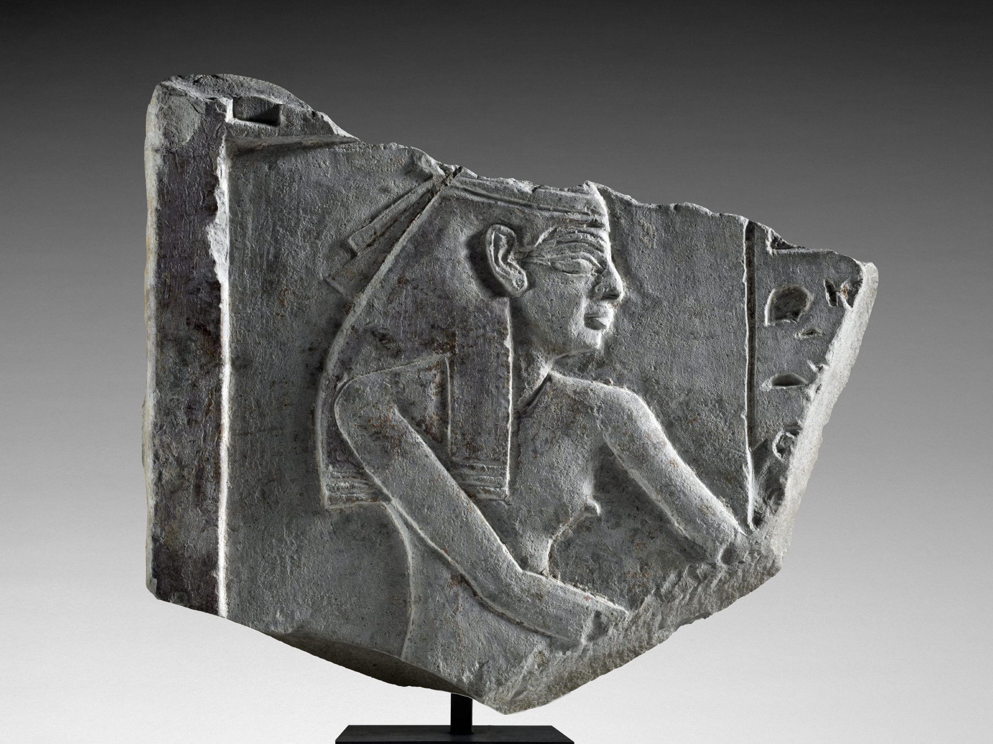 sculptée d’une figure féminine à mi-corps, tournée vers la droite. A l’origine, cette figure était placée au sein d’une composition plus vaste, comme le suggèrent la bordure saillante à gauche (et sans doute au-dessus) et l’inscription hiéroglyphique en partie lacunaire à droite.