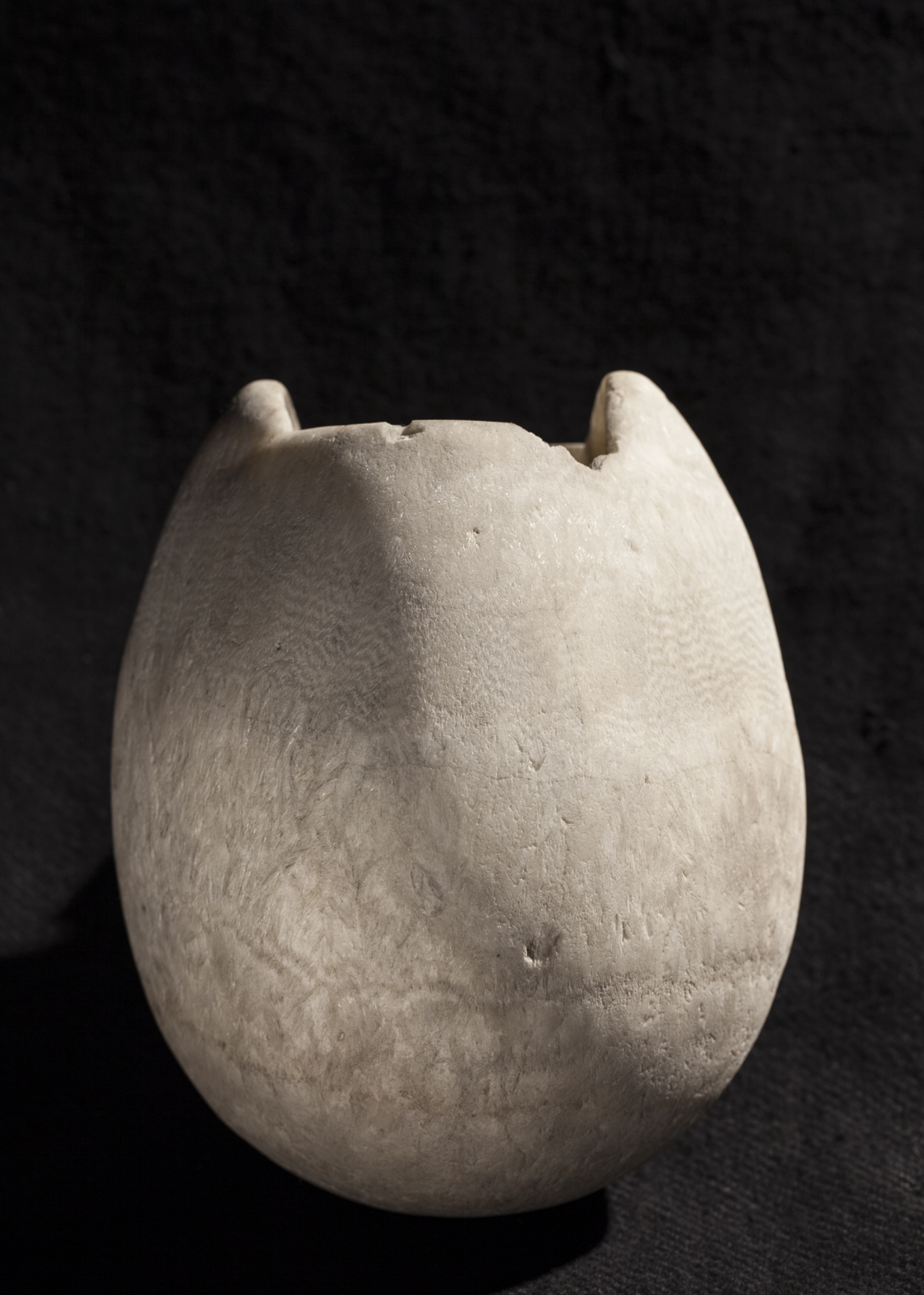 S’il s’agit d’un objet égyptien, la forme de ce vase correspond peut être à la matérialisation en pierre d’un objet usuel ou d’un aliment, simulacre destiné à équiper une tombe. Afin d’assurer l’offrande nécessaire à la vie dans l’au-delà, dans la nécropole de Saqqâra par exemple, des contenants en albâtre en forme d’objets, d’animaux ou de fruits ont été retrouvés dans des sépultures de la fin de l’Ancien Empire.