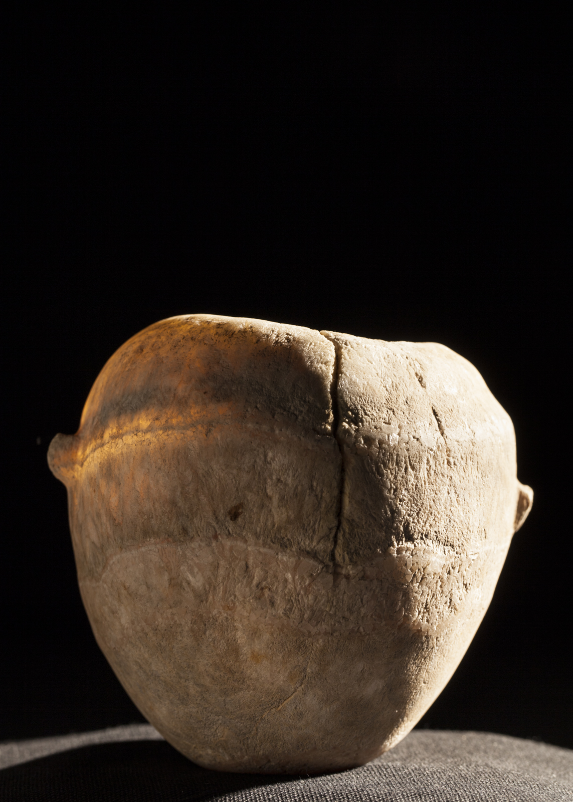 Forme ovoïde. Pas de col. La lèvre n’étant pas marquée, le col était peut-être amovible. A son point d’inflexion, deux petits tenons en forme d’oreille ornent la panse. Le fond étant arrondi, le vase ne tient pas debout.
