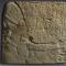 khepresh. Placé au ras de son cou, un double rang de perles circulaires se remarque. Sous ce bras tendu, deux petites plumes obliques sont visibles. Si l'état du bloc ne permet pas d'appréhender l'attitude complète du souverain, une pancarte, placée en haut et à droite, mentionne sa