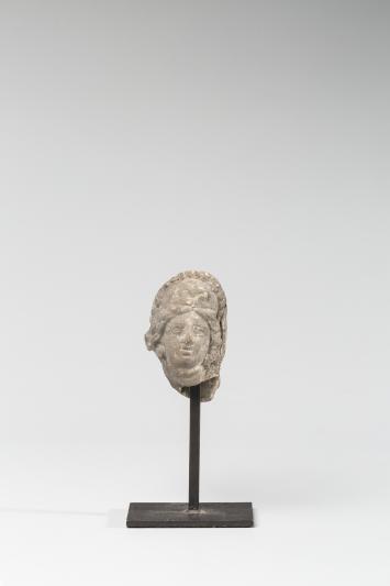 Il s’agit d’une tête de personnage féminin richement paré. Elle se penche vers la gauche, le regard levé vers le ciel. Elle est coiffée d’un diadème décoré en relief et surmonté de perles et de boucles d'oreilles. Ses cheveux forment des coques réparties de part et d'autre d'une raie médiane et encadrant le visage. Elle a le visage rond, au front bas. Ses yeux sont enchâssés entre des paupières épaisses. Elle a le nez droit, la bouche étroite et les lèvres épaisses.