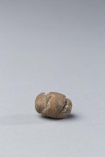 Composée d’un élément arrondi central, encadré de deux éléments arrondis plus petits, la forme tripartite de l’objet évoque celle d’un coquillage dont l’espèce est à l’heure actuelle indéterminée. L’image ne correspond en effet pas à celle d’un cauri, particulièrement représenté dans l’iconographie et l’orfèvrerie égyptienne depuis les débuts de la période historique. Par comparaison avec une amulette en faïence bleue trouvée à Hélouan (in KÖHLER 2018, fig. 27 p. 45), il faudrait plutôt y voir une amulette, en forme de symbole du dieu Min. De ce dieu de la fertilité égyptienne, seigneur de Coptos et d'Akhmîm, le musée conserve des reliefs provenant de la salle de Pount de son temple à Athribis-Wannîna, ainsi qu'une figurine d'Amon-Min-Kamoutef en bois (Inv. N° Co. 2451 / Co. 6254).