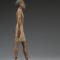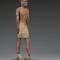 Cette statuette de bois représente un homme debout, vêtu d’un pagne, dans l’attitude de la marche, la jambe gauche en avant, les bras ballants le long du corps, paumes ouvertes contre les cuisses. Les pieds sont encastrés dans un long socle rectangulaire. Sur le crâne, une fine couche de cheveux naturels est figurée par de la peinture. La polychromie est bien visible  : la chevelure, les sourcils et les yeux sont ocre noir, la carnation et les contours de la ceinture et des plis du pagne ocre rouge, le fond du pagne blanc-crème. On remarque une nette différence de teinte entre les deux bras et le reste du corps. Maintes fois restauré et restitué, Co. 650 offre un aspect hétérogène, qui peut déconcerter au premier abord. La coiffure peinte en noir correspond le plus probablement à une chevelure naturelle rase. Une représentation d’une chevelure naturelle, peinte en volume, s’observe par exemple sur la célèbre statue en calcaire dite du «  scribe accroupi  » du musée du Louvre, datée de la IVe dynastie et trouvée à Saqqâra par Auguste Mariette (inv. n° N 2290  ; E 3023, voir ZIEGLER 1997, p. 204-208 : n° 58). Le type de coiffure du personnage du musée Rodin, plaquée contre son crâne, est parfois considéré comme une perruque très courte de type calotte, imitant une épaisseur de cheveux naturels (HARVEY 2001, p. 655, fig. 1b et p. 12  : W.3). Les yeux, incisés et peints, sont grands ouverts. Ils sont soulignés par un trait de maquillage s’étirant en légères pointes sur les tempes et dans le creux interne de l’œil, ainsi que par de fins sourcils arqués. Le nez, fortement repris à l’époque moderne, est petit et triangulaire ; en l’état, son profil ne correspond plus aux canons égyptiens. La bouche, difficilement lisible aujourd’hui, paraît large et charnue. Les lèvres semblent avoir été gonflées par des aplats de polychromie, à moins que la dégradation du bois n’induise l’observateur en erreur. Les oreilles de taille moyenne, le front droit et empiété par la chevelure, les pommettes hautes, les joues pleines et le menton petit et rond forment un visage ovale, franc et bien proportionné, soutenu par un cou délié. Les épaules sont larges, le torse mince, les hanches menues, la taille svelte. La poitrine et le nombril sont à peine esquissés. Les bras, frêles et droits, aux articulations absentes, et apparemment dénués de polychromie, dénotent par rapport au reste du corps. Les mains, longues et fines, sont dotées de doigts fuselés séparés par de légers surcreux dans le bois, mais a priori sans ongle. On remarque que les démarcations des phalanges sont plus visibles sur la main droite que la main gauche, cette dernière apparaissant plus claire et plus usée. Si le corps, le pied et le socle de la statuette ont été sculptés en figuier sycomore, les bras sont en jujubier. Quoique bien proportionnés au personnage, ils ont pu être prélevés sur une autre statue, le bras droit étant même sectionné au niveau des biceps. Ils peuvent ainsi être un réemploi, provenant d’une autre statuette brisée ou devenue inutile, les bras ayant été assemblés au corps au moment de l’élaboration de Co. 650, ou plus tard, en guise de réparation. L’homme est vêtu d’un pagne uni à bord arrondi, au pli de retour clairement figuré à l’avant. Le pagne est maintenu par une ceinture plate unie sans nœud, légèrement arrondie et remontée sur les hanches (HARVEY 2001, p. 658, fig. 3, p. 24, n° D2.f). Une ligne ocre-rouge souligne les bords du tissu (voir en particulier le pli de retour du pagne et les bords de la ceinture). Le pagne, très serré et s’arrêtant au-dessus du genou, contribue à dessiner une silhouette juvénile et élancée. Le fessier est petit et pointu, les jambes sont longues et minces, les articulations esquissées et délicates. Les pieds sont très abîmés et cassés  : une partie de la cheville droite, ainsi que les orteils du pied gauche, manquent. Les orteils du pied droit sont démarqués par des incisions. Les ongles ne sont pas apparents, sans doute à cause de la mauvaise conservation du bois et de la polychromie. Le socle sur lequel la statuette est placée, bien qu’à présent dépourvu de polychromie et d’inscription, était vraisemblablement destiné à être peint et porteur d’un texte. L’inscription comprenait usuellement le nom et les titres du défunt (voir, pour comparaison, le texte incisé sur le socle en bois de la statue de Tchétchi provenant du serdab de sa tombe (n° 6001 à Saqqâra), datant du règne de Pépi II (VIe dynastie). Cette statue, conservée au Metropolitan Museum of Art, représente le défunt dans sa jeunesse (inv. n° 26.2.8a.b). La statue du musée Rodin est composée de plusieurs éléments, assemblés à l’aide d’un système de tenon mortaise  : à la pièce principale, constituée de la tête, du corps et des jambes, sont ainsi rattachés les deux bras, les deux pieds et le socle rectangulaire. Une cheville de bois est visible dans le bras droit au niveau de l’épaule. Ce bras droit est aujourd’hui en deux parties  : on remarque une démarcation au-dessus de l’articulation du coude. Les deux pièces du bras droit sont fixées ensemble par un tenon traversant. L’extrémité inférieure des jambes est insérée dans la partie supérieure des pieds, sculptés séparément, grâce au même système de tenon mortaise et plus spécifiquement des chevilles de bois d’une longueur de 2,5 cm. Le socle présente deux encoches pour les pieds. Ces derniers sont maintenus dans le socle via des petites pièces de bois ajustées et aujourd’hui collées. La posture et la taille de Co. 650 tendent à montrer qu’il serait la représentation funéraire d’un maître de maison, propriétaire de la tombe. Il est tout à fait possible qu’il ait fait partie d’un groupe de statuettes funéraires de tailles et d’ap