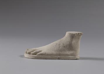 Modèle de sculpteur en calcaire fin représentant un pied gauche ainsi qu’une cheville. L’ensemble repose sur un socle de 0,44 mm de hauteur épousant la forme générale du pied. L’extrémité du petit orteil (ou quintus / exterius) est cassée, l’orteil précédent (ou quartus / pre-exterius) est légèrement abîmé.