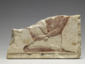 Ce fragment de bas-relief en calcaire donne à voir la partie inférieure d’une scène sculptée en creux, dont seule une figure masculine est conservée.