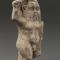 Le visage de Bès est rond. Le front du génie est couvert par un large bandeau sous lequel apparaissent d’épais et broussailleux sourcils représentés par des séries d’incisions parallèles représentant à la fois les poils ainsi que les plis de la peau formés par la grimace que réalise Bès. Ces rides sont encore marquées à la base du nez par des incisions profondes parallèles et horizontales. Les yeux sont grands, très ouverts, et l’on peut encore observer les pigments des pupilles. Le nez est court et épaté. La saillance des pommettes est représentée par des incisions parallèles qui partent de l’aile du nez jusqu’aux oreilles. L’oreille droite est fortement décollée du crâne et est très ronde. Là encore, deux incisions parallèles dessinent l’ensemble de l’oreille. L’oreille est creuse et l’on observe que des incisions verticales et parallèles très profondes font ressortir trois éléments de forment rectangulaire. Il pourrait s’agit d’un élément anatomique de l’oreille mais il est également possible qu’il s’agisse de bijoux. L’oreille de gauche, en revanche, est complètement collée au crâne et est de forme ovale. Quasiment plate, son lobe est légèrement en relief. L’oreille gauche est plus longue que l’oreille droite mais semble dépourvue de bijoux. Bès arbore un collier de barbe reparti des deux côtés de son nez. Sous le double trait de chaque pommette pendent en effet huit boucles du côté droit et sept du côté gauche. Chaque boucle du côté droit est formée de trois incisions verticales et parallèles tandis que chaque boucle du côté gauche est composée de deux incisions verticales et parallèles, donnant à la barbe un aspect à la fois fourni mais ordonné et élégant. Les lèvres supérieures du génie sont pulpeuses, remontant vers le nez. En-dessous, on observe une rangée de sept petites dents rangées parallèlement et toutes de la même taille. L’état de conservation actuel de la sculpture ne permet pas de discerner les détails de la lèvre inférieure ni du menton. La tête du génie est collée au buste. Le bandeau n’apparaît pas de l’autre côté de la tête. Le génie porte une couronne en forme de mortier, un des couvre-chefs du génie les plus courants. Le bout de l’arme tenue par le génie dans sa main droite apparaît sur le dessus de la tête, accolée au couvre-chef. Au dos on observe que la chevelure du génie se termine par une boucle apparaissant en haut du dos. Le vide entre le bras droit et le reste du corps est comblée tout comme le vide entre l’avant-bras gauche et e ventre ainsi qu’entre les jambes. Le dos du génie est peu galbé. Les fesses du génie sont posées sur un socle de pierre. Entre ses reins apparaît une petite queue légèrement incisée qui part de chacune des hanches et qui court le long du socle. Le numéro d’inventaire actuel est inscrit à l’encre noire sur pellicule isolante dans l’angle inférieur gauche du socle de pierre. La statue est couverte en de nombreux endroits de résidus d’enduit. On observe également de nombreuses traces de terre de fouille notamment dans les cavités à l’instar des oreilles.