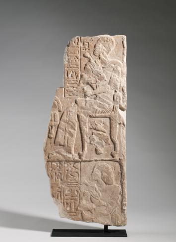Sur ce bloc de calcaire fin comportant quelques rares inclusions grisées, un panneau extrait de la paroi d’un tombeau a conservé une scène de banquet funéraire, disposée en deux registres incomplets. Le décor est gravé en relief par rapport au fond tandis que les hiéroglyphes sont incisés en creux. Une colonne d’encadrement est visible derrière les deux personnages. Le bloc était à l’origine brisé en deux morceaux, aujourd’hui recollés. L’observation du profil indique nettement une courbe dans la partie supérieure. Cette courbe ne semble pas imputable à cette cassure mais annonce la forme de la paroi de la tombe d’où provient ce panneau.