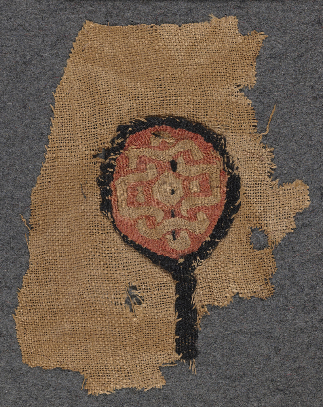 Cet élément présente une version simplifiée des décors de médaillons à entrelacs (1991 Textiles d'Egypte, n°16 - IVe-Ve s.). Il devait probablement se placer dans le prolongement d'un clavus de châle ou de tunique.