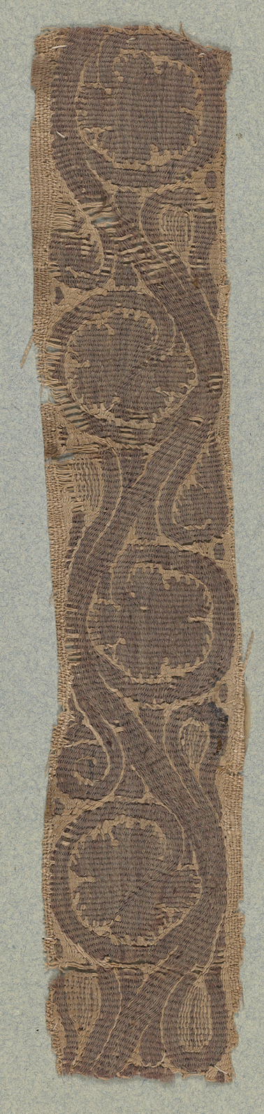 Ce fragment de bande est décoré d'un rinceau de vigne. De la tige sinusoïdale partent, alternativement à gauche et à droite, de petites et grandes volutes, les grandes se terminant par des feuilles quintilobées.