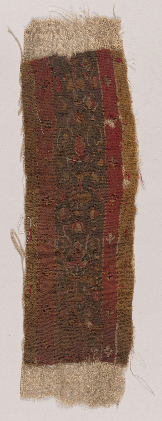 Ce décor est tout à fait comparable à celui d'un clavus de la collection Bouvier (1991 Textiles d'Egypte, n° 74 p. 165 - Antinoë probablement, VIIe - VIIIe s.), qui y voit "l'influence des "arbres-chandeliers" sassanides qui occupèrent une place prépondérante dans l'art byzantin et les productions des premiers temps de l'Islam" (1991 Textiles d'Egypte, p. 166).