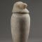 Le bouchon, sommairement taillé, représente une tête de babouin cynocéphale, reconnaissable à sa tête large et son museau allongé. Seuls les contours des yeux et un simple trait pour la bouche sont gravés dans l’albâtre. Au-dessous, un décochement forme un tenon permettant l’emboîtement du bouchon sur le vase.